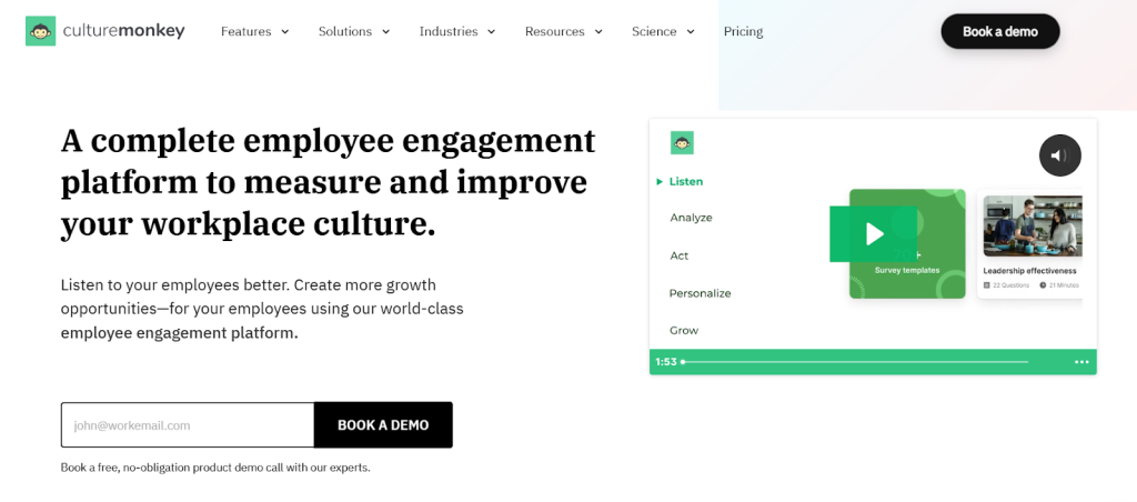 CultureMonkey is a platform focused on employee engagement and feedback, helping organizations build a connected and motivated workforce. It allows companies to run customized surveys, gather anonymous feedback, measure employee sentiment, and track engagement in real time.